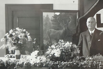 Hirsch, Blumenschmuck und Hakenkreuz - ein Bild, gefunden im Archiv der Akademie. Es ist rückseitig datiert mit dem 18. Juni 1937. Die Aufnahme entstand höchstwahrscheinlich im Hörsaal 2. Der Anlass ist nicht bekannt. (Quelle: Bildarchiv Akademie Karlsruhe)
